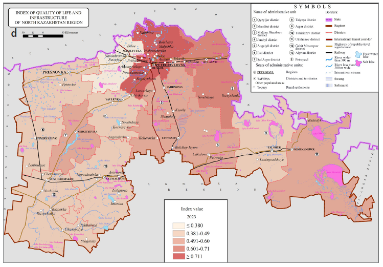 At the international level, significant progress has been made in formalizing composite index systems. Geniaux et al. (2009) classify sustainable development indicator systems based on degree of aggregation, spatial coverage, and analytical purpose. Their classification is useful for comparing approaches used in Kazakhstan. Lacmanović and Tijanić (2025) explore the progress of social policy in the EU by applying the Social Progress Index (SPI), and Wang and Chen (2022) apply principal component analysis to assess social sustainability, demonstrating its effectiveness in reducing multidimensional data. The annual report of the Social Progress Imperative (2025) offers updated data and methodologies for assessing social progress, focusing on rights, health, and opportunities. The World Social Report by the United Nations (2025) provides a framework for assessing social sustainability through the lenses of equity and solidarity. The Sustainable Development Report by SDSN (2024) justifies the metrics for achieving the SDGs and provides a foundation for constructing comparable subnational indices. Examples of regional differentiation in social sustainability highlight the potential for using GIS and remote sensing technologies.