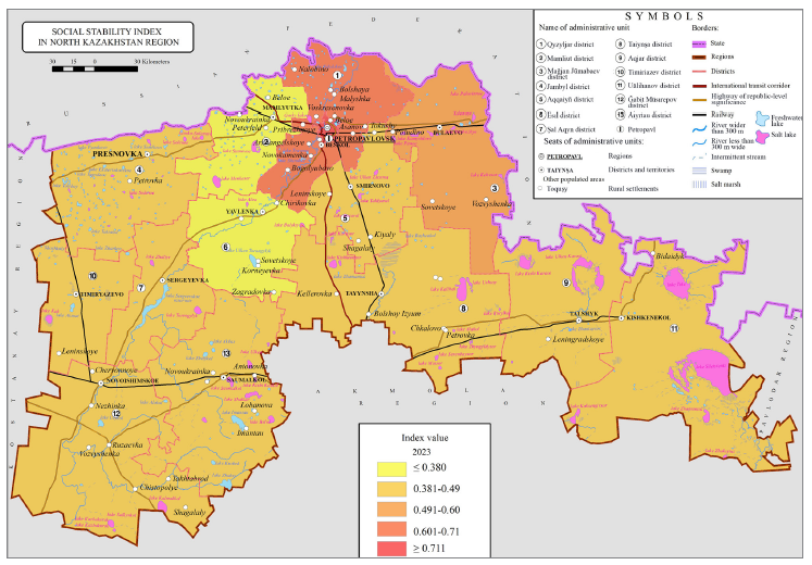 This research makes a new contribution because, for the first time, a long-term district-level assessment of social sustainability has been conducted for a region of Kazakhstan. Unlike previous studies limited to interregional comparisons, the methodology allows for the identification of hidden intra-regional disparities and their correlation with the SDGs. The findings complement international research on transitional economies and offer a reproducible platform for regular monitoring at the level of local governance. The hypothesis of the study is that regional differentiation in social sustainability in the North Kazakhstan Region necessitates implementing targeted sustainable development programmes aimed at reducing territorial disparities and improving the quality of life of the population. To test this hypothesis, a composite social sustainability index was calculated, followed by a spatial analysis of its distribution across the region.