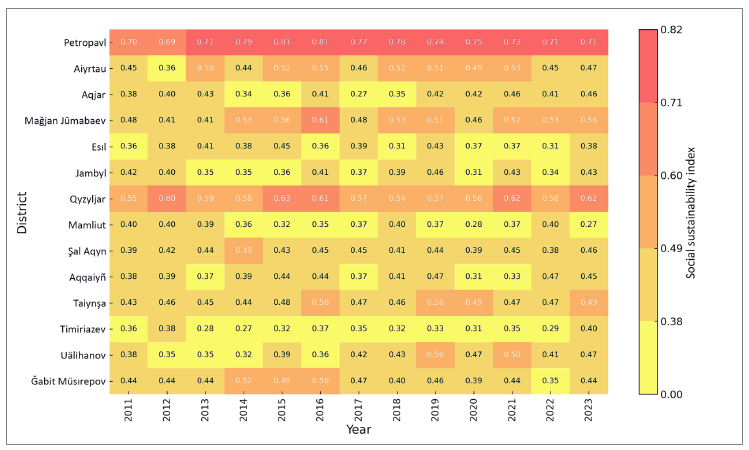 Figure 3: Dynamics of the social sustainability index across the districts of the North Kazakhstan Region, 2011–2023 (illustration: authors, based on official statistical data).
