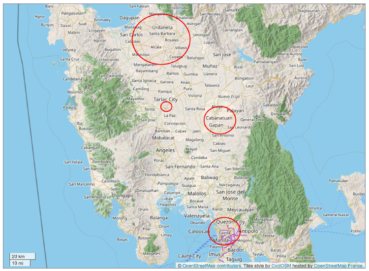 The visual stimuli were drawn from an extensive photo bank assembled specifically for this project. Thousands of candidate photos of urban scenes were taken by a research team during multiple field visits. To maximize generalizability, images were taken across a rural–urban gradient. Figure 1 shows the locations where they were taken. Approximately two-thirds (66.1%) of the photos came from sites within Pangasinan, 17.9% from Metro Manila, 14.2% from the nearby province of Nueva Ecija, and the remaining 1.8% from Tarlac. All photos were taken under comparable conditions to control for lighting and sky conditions. The photos were taken using standard focal lengths (24–50 mm full-frame equivalent) with minimal post-processing (horizon levelling and exposure normalization only) to preserve a natural appearance. Display settings were standardized across sessions (auto-brightness disabled, screen brightness ≥ 50%).