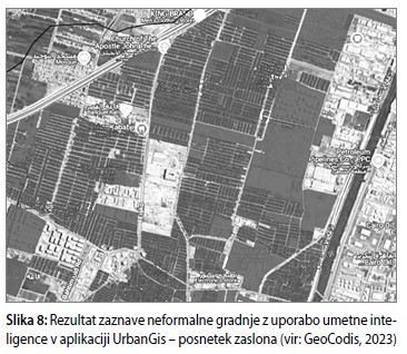 Slika 9: Rezultat zaznave neformalne gradnje z uporabo umetne inteligence v aplikaciji UrbanGis – posnetek zaslona (vir: GeoCodis, 2023)