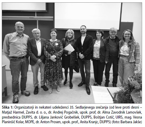 Slika 1: Organizatorji in nekateri udeleženci 35. Sedlarjevega srečanja (od leve proti desni – Matjaž Harmel, Zavita d. o. o., dr. Andrej Pogačnik, upok. prof, dr. Alma Zavodnik Lamovšek, predsednica DUPPS, dr. Liljana Jankovič Grobelšek, DUPPS, Boštjan Cotič, UIR