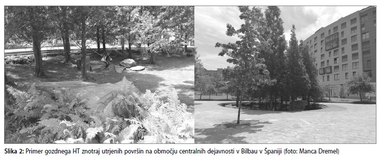 Slika 2: Primer gozdnega HT znotraj utrjenih površin na območju centralnih dejavnosti v Bilbau v Španiji (foto: Manca Dremel)