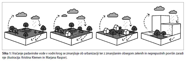 Slika 1: Vračanje padavinske vode v vodni krog se zmanjšuje ob urbanizaciji ter z zmanjšanim obsegom zelenih in neprepustnih površin zaradi nje (ilustracija: Kristina Klemen in Marjana Raspor)