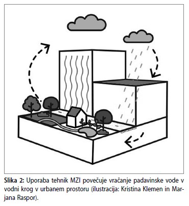 Slika 2: Uporaba tehnik MZI povečuje vračanje padavinske vode v vodni krog v urbanem prostoru (ilustracija: Kristina Klemen in Marjana Raspor).