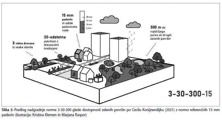 Slika 3: Predlog nadgradnje norme 3-30-300 glede dostopnosti zelenih površin po Cecilu Konijnendijku (2021) z normo referenčnih 15 mm padavin (ilustracija: Kristina Klemen in Marjana Raspor)