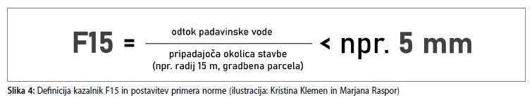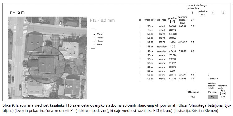 Slika 10: Izračunana vrednost kazalnika F15 za enostanovanjsko stavbo na splošnih stanovanjskih površinah (Ulica Pohorskega bataljona, Ljubljana) (levo) in prikaz izračuna vrednosti Pe (efektivne padavine), ki daje vrednost kazalnika F15 (desno) (ilustracija: Krist