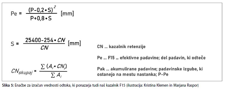 Slika 5: Enačbe za izračun vrednosti odtoka, ki ponazarja tudi naš kazalnik F15 (ilustracija: Kristina Klemen in Marjana Raspor)