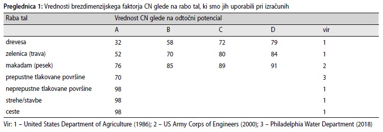 Slika 6: Vrednosti brezdimenzijskega faktorja CN glede na rabo tal, ki smo jih uporabili pri izračunih