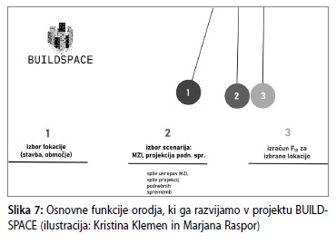 Slika 8: Osnovne funkcije orodja, ki ga razvijamo v projektu BUILDSPACE (ilustracija: Kristina Klemen in Marjana Raspor)