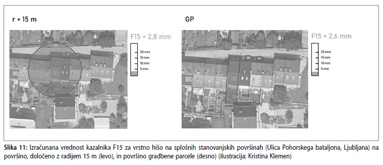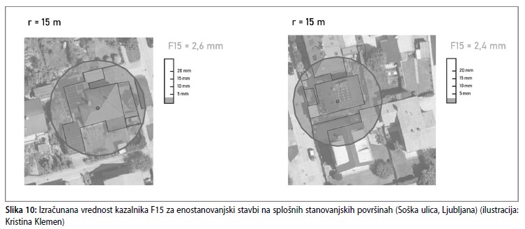 Slika 11: Izračunana vrednost kazalnika F15 za enostanovanjski stavbi na splošnih stanovanjskih površinah (Soška ulica, Ljubljana) (ilustracija: Kristina Klemen)