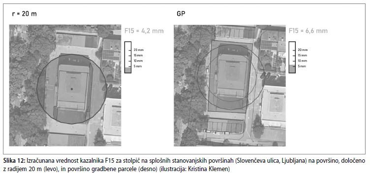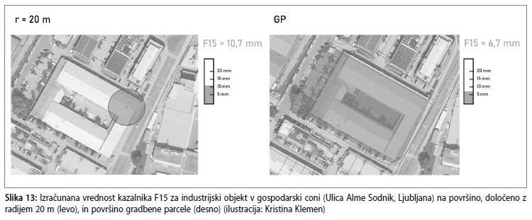 Slika 13: Izračunana vrednost kazalnika F15 za stolpič na splošnih stanovanjskih površinah (Slovenčeva ulica, Ljubljana) na površino, določeno z radijem 20 m (levo), in površino gradbene parcele (desno) (ilustracija: Kristina Klemen)