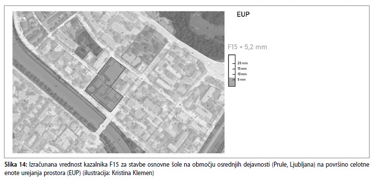 Slika 15: Izračunana vrednost kazalnika F15 za stavbe osnovne šole na območju osrednjih dejavnosti (Prule, Ljubljana) na površino celotne enote urejanja prostora (EUP) (ilustracija: Kristina Klemen)