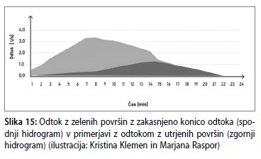 Slika 16: Odtok z zelenih površin z zakasnjeno konico odtoka (spodnji hidrogram) v primerjavi z odtokom z utrjenih površin (zgornji hidrogram) (ilustracija: Kristina Klemen in Marjana Raspor)