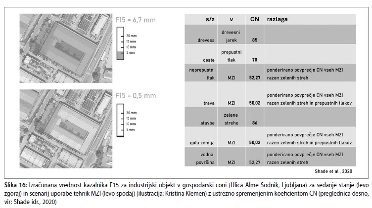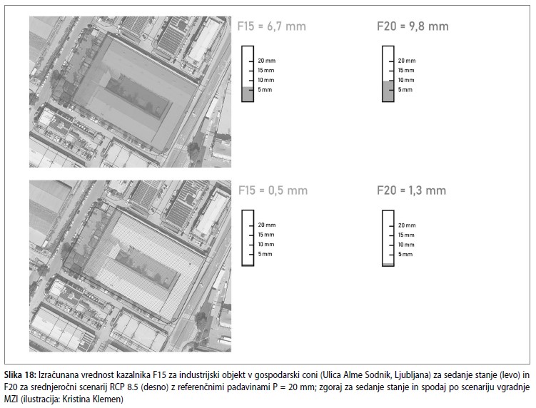 Slika 17: Izračunana vrednost kazalnika F15 za industrijski objekt v gospodarski coni (Ulica Alme Sodnik, Ljubljana) za sedanje stanje (levo zgoraj) in scenarij uporabe tehnik MZI (levo spodaj) (ilustracija: Kristina Klemen) z ustrezno spremenjenim koeficientom CN