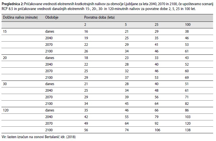 Slika 18: Pričakovane vrednosti ekstremnih kratkotrajnih nalivov za območje Ljubljane za leta 2040, 2070 in 2100, če upoštevamo scenarij RCP 8.5 in pričakovane vrednosti današnjih ekstremnih 15-, 20-, 30- in 120-minutnih nalivov za povratne dobe 2, 5, 25 in 100 let