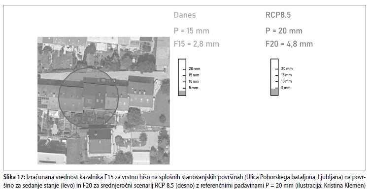 Slika 19: Izračunana vrednost kazalnika F15 za vrstno hišo na splošnih stanovanjskih površinah (Ulica Pohorskega bataljona, Ljubljana) na površino za sedanje stanje (levo) in F20 za srednjeročni scenarij RCP 8.5 (desno) z referenčnimi padavinami P = 20 mm (ilustrac
