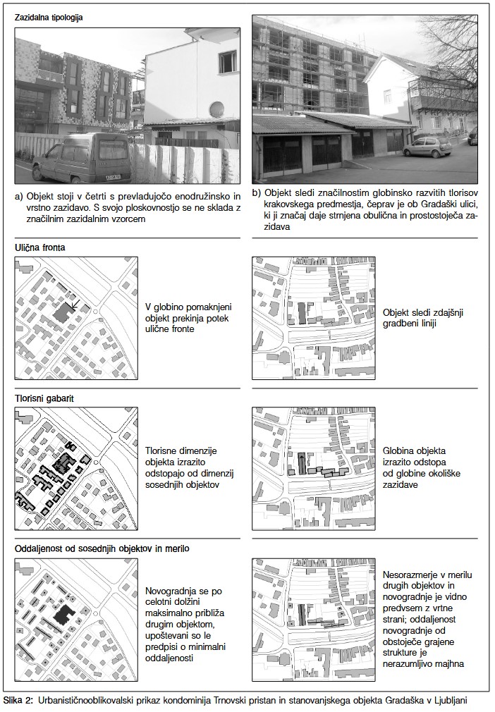 Notranji razvoj mest se v sodobni urbanistični praksi kaže kot ena najbolj vzdržnih oblik razvoja mest, ki ima številne prednosti pred širjenjem mest na nova zemljišča. Poleg vseh prednosti pa odpira tudi dileme, kako novogradnje umeščati v že izoblikovano urbano okolje, da ne bi sprožili estetske ali funkcionalne degradacije in hkrati ne bi bila kratena legitimna pričakovanja investitorjev o donosnosti naložbe. Članek obravnava metodologijo za oceno in spodbujanje urbanističnooblikovalskih kvalitet in ekonomske učinkovitosti projektov za razvoj/prenovo mestnih lokacij. Uporabnost te metode je prikazana na analizi ljubljanskih primerov nadomestne oziroma dopolnilne gradnje (večstanovanjski objekt na Gradaški ulici in kondominij v Trnovskem pristanu), ki sta s svojo nekonvencionalnostjo vzbudila pozornost širše javnosti, z vidika urbanističnooblikovalskih meril pa v marsičem zanikata zdajšnji značaj prostora.